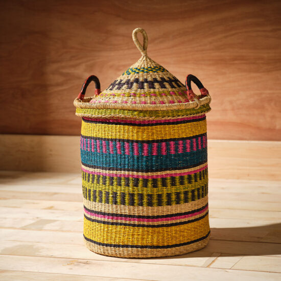Handwoven Bolga Laundry Basket with Lid – Yellow and Blue