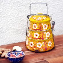 In India food cooked at home with care and love is considered to deliver not only healthy (and relatively cheap) food but also divine contentment. Lunch is usually eaten thali-style, with a tantalising selection of regional delicacies that may include any combination of spicy vegetables, dhal, rice, yoghurt, pickles, bread and pudding served on a big steel plate or a banana leaf. The separate compartments in the tiffin lunchbox accommodate thali lunches perfectly.