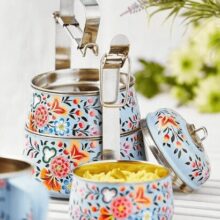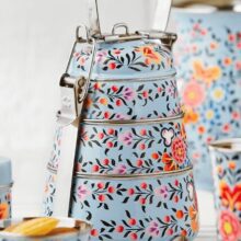 Adapted as an answer to British peculiarities such as afternoon tea. This enamelware 3-tier tiffin box set is hand-painted on the outer surface in a fresh, multi-floral design on 3 beautiful background colours.