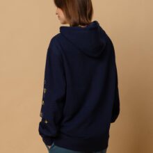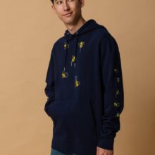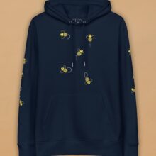 Introducing the Bee Hoodie—a perfect blend of style, comfort, and sustainability. Designed for eco-conscious fashion lovers, this unisex navy hoodie is crafted from 100% organic cotton, making it an essential addition to any wardrobe. The sleek navy design is brought to life with playful, yellow bees scattered across the front and sleeves flying in the pattern of our logo, adding a unique and vibrant touch. The hoodie features a regular fit with set-in sleeves and a double-layered hood for added warmth and comfort. The front pouch pocket is perfect for keeping your hands cosy, while the 1×1 rib at the sleeve and bottom hems ensures a snug fit. With a fabric weight of 10.32 oz./yd.² (350 g/m²), this hoodie is both durable and cosy, ideal for cooler weather. Attention to detail is evident in every stitch, from the single needle topstitch at the neckline and along the hood opening to the self-fabric half-moon and inside tape at the back of the neck. The metal eyelets add a touch of rugged sophistication, while the eco-friendly materials make this hoodie a responsible choice for those who care about the environment. Elevate your streetwear collection with the Navy Bee Hoodie—where sustainability meets style. Whether you’re out for a casual day or layering up for a cool evening, this hoodie is designed to keep you comfortable while making a statement. Embrace the buzz of fashion with the Bee Hoodie.