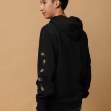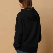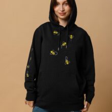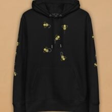 Introducing the Bee Hoodie—a perfect blend of style, comfort, and sustainability. Designed for eco-conscious fashion lovers, this unisex black hoodie is crafted from 100% organic cotton, making it an essential addition to any wardrobe. The sleek black design is brought to life with playful, yellow bees scattered across the front and sleeves flying in the pattern of our logo, adding a unique and vibrant touch. The hoodie features a regular fit with set-in sleeves and a double-layered hood for added warmth and comfort. The front pouch pocket is perfect for keeping your hands cosy, while the 1×1 rib at the sleeve and bottom hems ensures a snug fit. With a fabric weight of 10.32 oz./yd.² (350 g/m²), this hoodie is both durable and cosy, ideal for cooler weather. Attention to detail is evident in every stitch, from the single needle topstitch at the neckline and along the hood opening to the self-fabric half-moon and inside tape at the back of the neck. The metal eyelets add a touch of rugged sophistication, while the eco-friendly materials make this hoodie a responsible choice for those who care about the environment. Elevate your streetwear collection with the Black Bee Hoodie—where sustainability meets style. Whether you’re out for a casual day or layering up for a cool evening, this hoodie is designed to keep you comfortable while making a statement. Embrace the buzz of fashion with the Bee Hoodie.