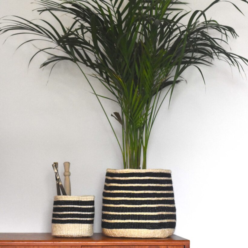 These black striped baskets have been handwoven by small women’s groups such as the Kasigau – who are located in an “elephant corridor” that connects the Tsavo West National Park with the Tsavo East National Park.