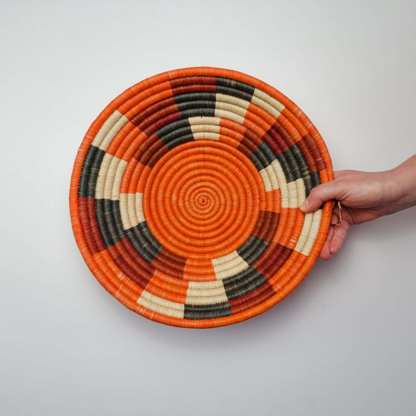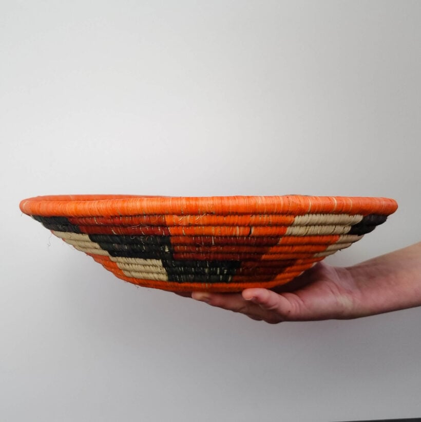 Enhance your home with a Woven Bowl from Uganda,. This striking bowl features vivid orange tones accented by earthy shades in spiral block colours. This versatile basket works as a centerpiece, wall hanging, or elegant storage solution. Handcrafted from sustainable sisal fibres, each bowl helps support women artisans and preserve traditional weaving skills. Its lightweight yet sturdy design fits effortlessly into both contemporary and boho-inspired spaces, adding texture, color, and a meaningful story to your decor.