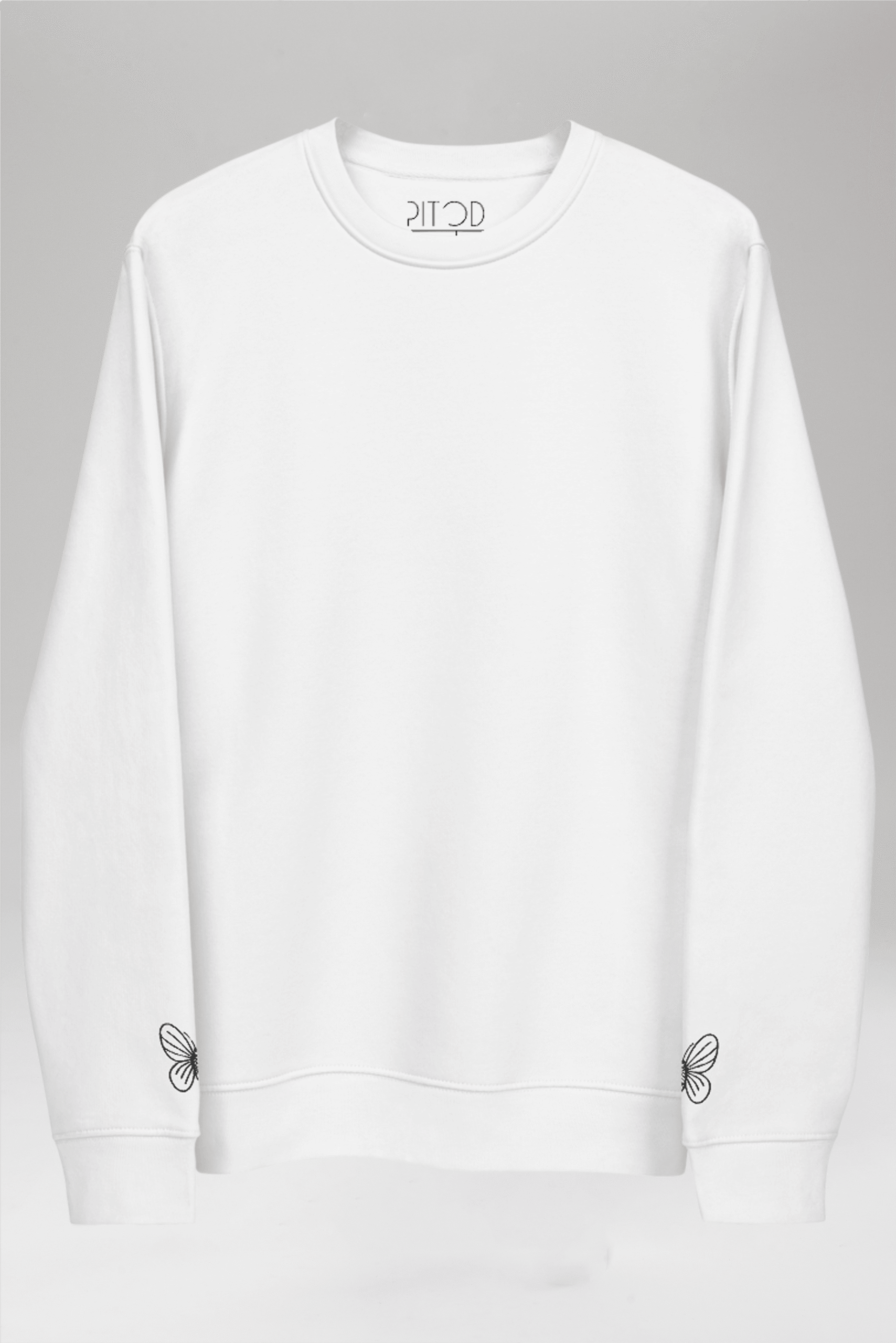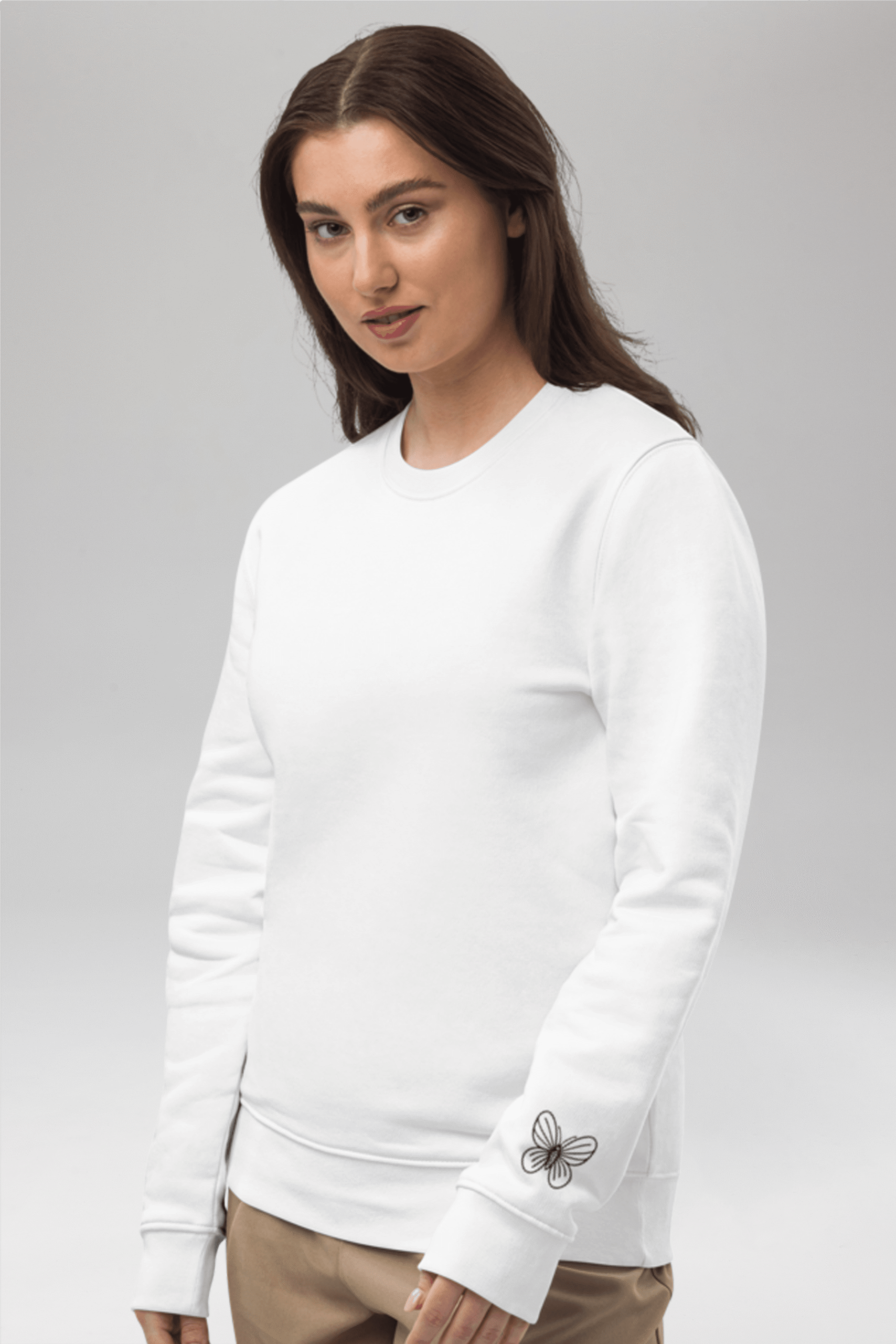 Indulge in the epitome of style and sustainability with our Butterfly Wrist White Sweatshirt—a versatile and chic addition to your wardrobe. This unisex eco sweatshirt, in classic white, boasts an exquisite embroidered butterfly on each wrist, adding a touch of elegance to your everyday look. Crafted from 100% organic ring-spun combed cotton, it not only provides durability but also contributes to a more sustainable fashion choice. The regular fit ensures comfort and a crisp appearance, making it suitable for both casual and dressed-up occasions. Wrap yourself in the softness of organic materials and make a conscious fashion statement—choose our Butterfly Wrist White Sweatshirt for a blend of style, comfort, and eco-friendliness.