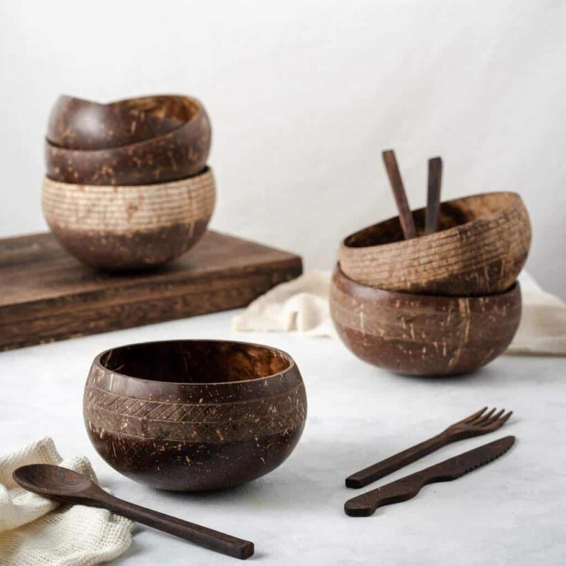 Once the coconut shell bowls have been harvested they are hand carved by talented craftsmen to create a selection of stunning patterns. Organic, eco-friendly & sustainable. Complete the wooden kitchen aesthetic by adding some of our wooden cups and bamboo cutlery!