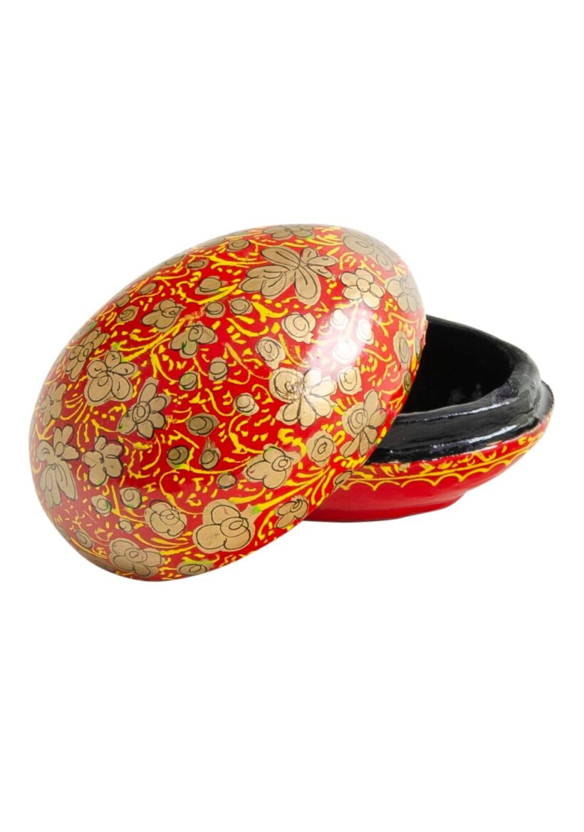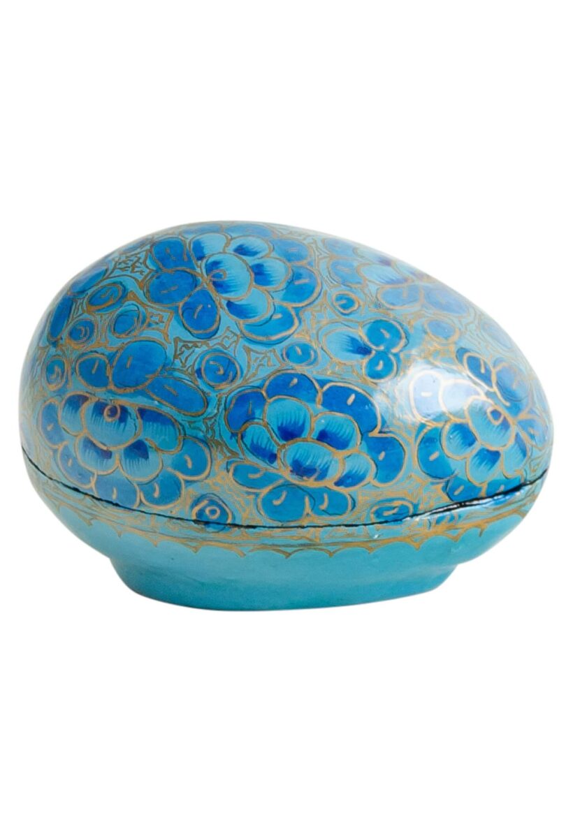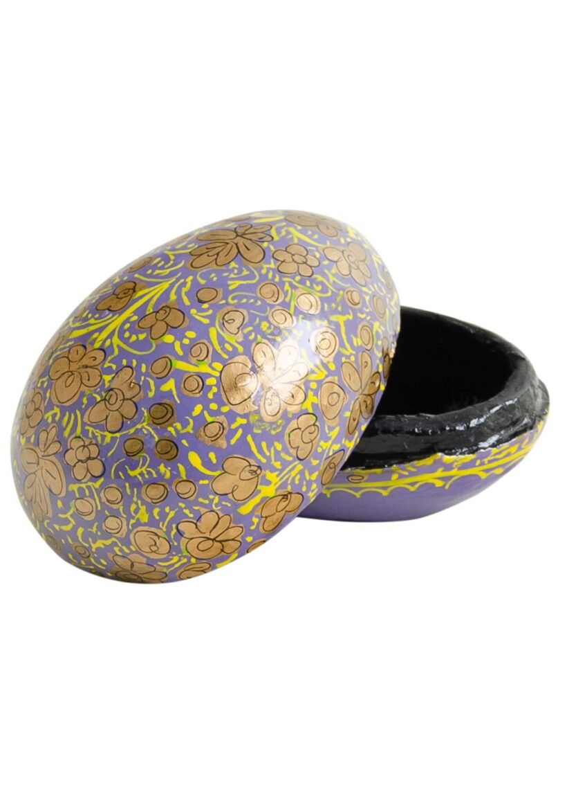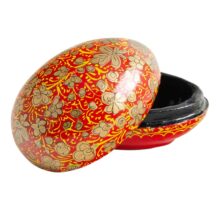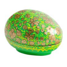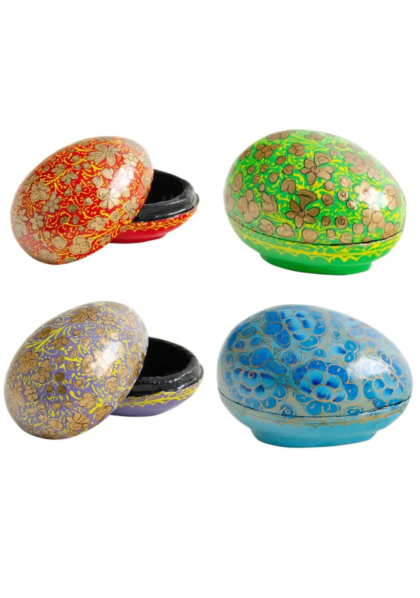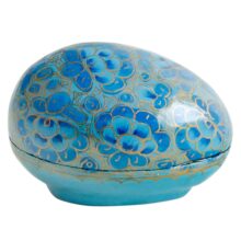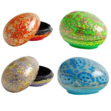 A novelty papier mache egg-shaped trinket box comes in a light blue, green, red and lilac design. Each is hand-painted in a gentle gold embellished pattern which is beautifully highlighted by a shiny glaze. These fun decorations are a shatterproof solution for Easter festivities. They will also make a lovely gift at any time of year.