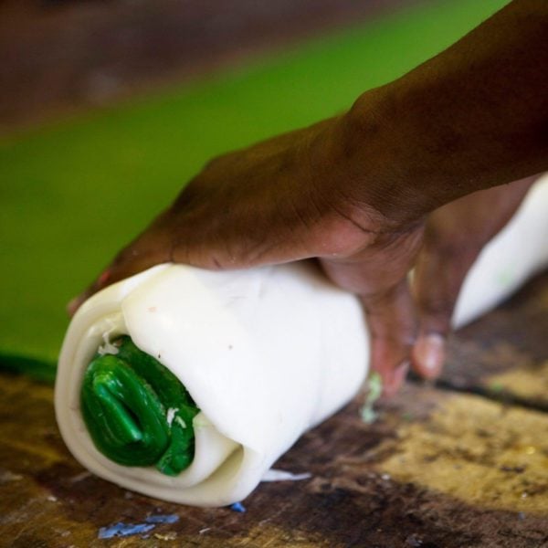 The wax is colored by mixing pigments with hot wax which is then poured into flat sheets. Sheets are marked and cut and carefully layered according to the design. The resulting slabs are compressed, extruded and re-extruded and then sliced into thin veneers. These veneers are then taken by the candle makers and skillfully stretched over a core of pure white wax and hand made into the desired shapes. See my listings for other amazing candles!