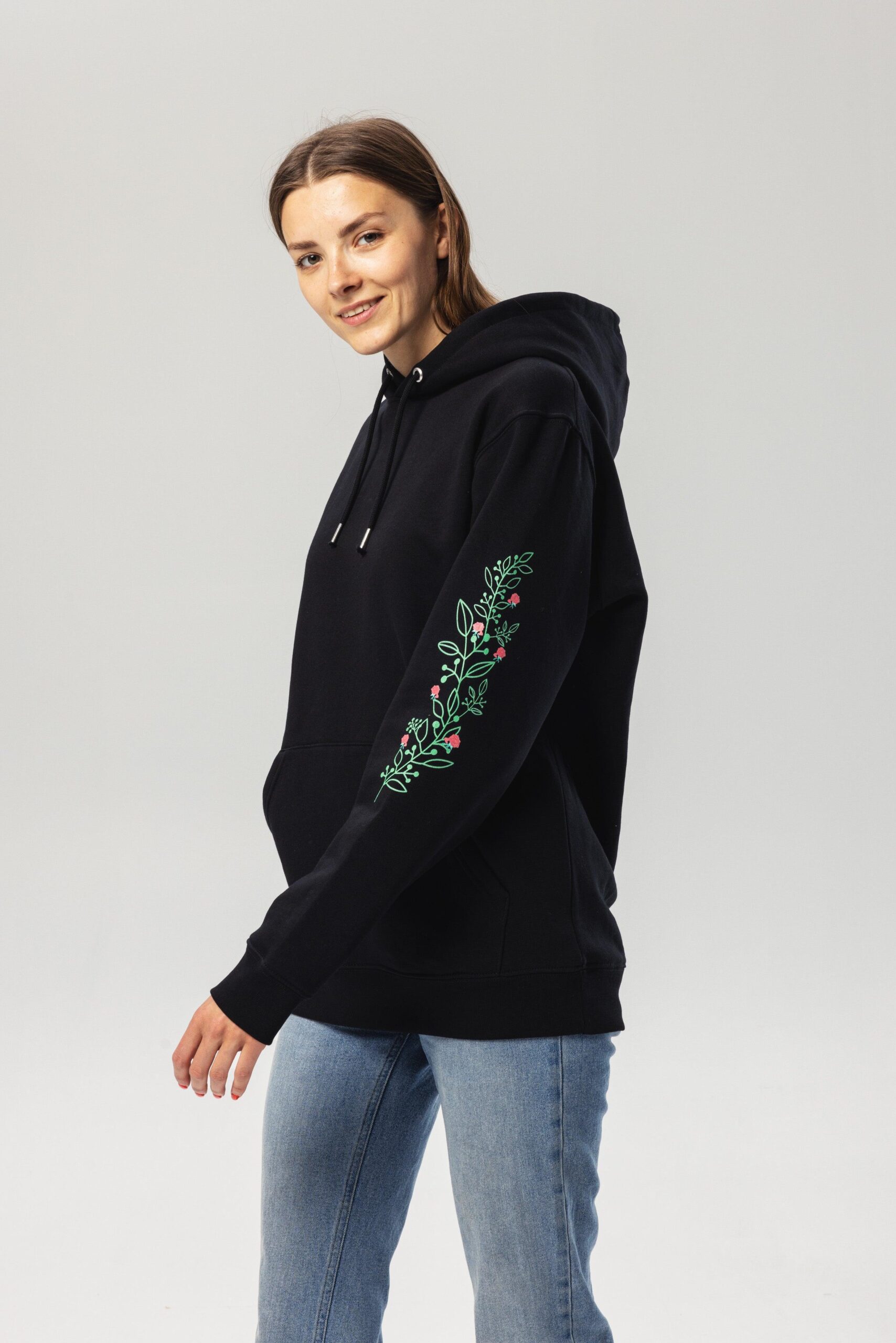 Elevate your streetwear game with our Unisex Essential Eco Hoodie, made from 100% Organic Cotton. This eco-friendly black hoodie is not only comfortable, but it’s also stylish with its clean-cut design and athletic fit. The double-layered hood, set-in sleeves, and front pouch pocket make it the perfect choice for any casual occasion. But what sets it apart is the unique flower tree design on both sleeves, adding a touch of nature to your wardrobe. Stay sustainable and stylish with our Flower Tree Hoodie.