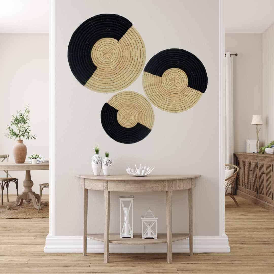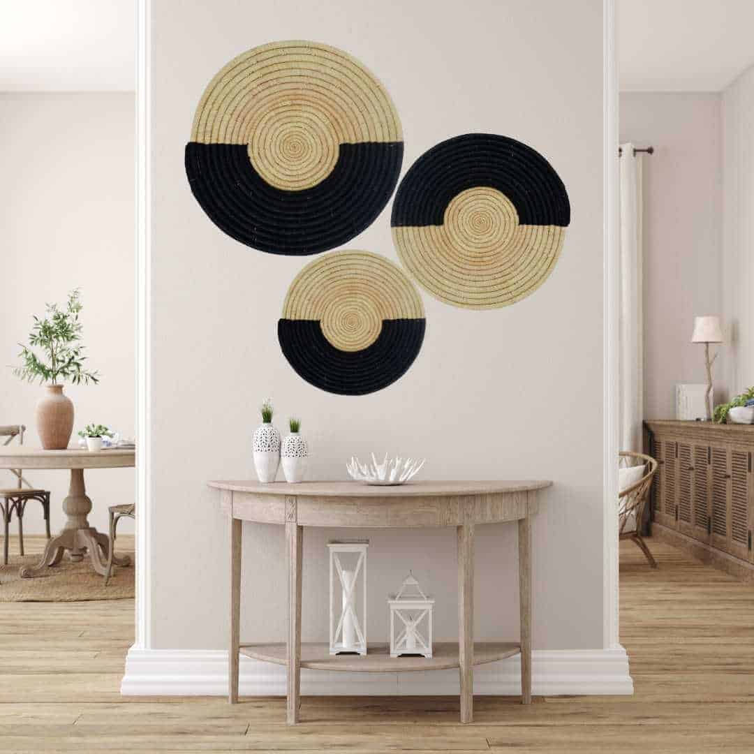 Transform your walls with this beautiful set of three woven wall discs, crafted by skilled artisans using natural raffia and papyrus. These statement pieces feature an eye-catching design, with half of the wide outer rim in striking black tones. The versatile pattern allows for creative arrangements—place them in a straight line for a sleek, uniform look, or rotate the discs to create unique angles for added visual interest.