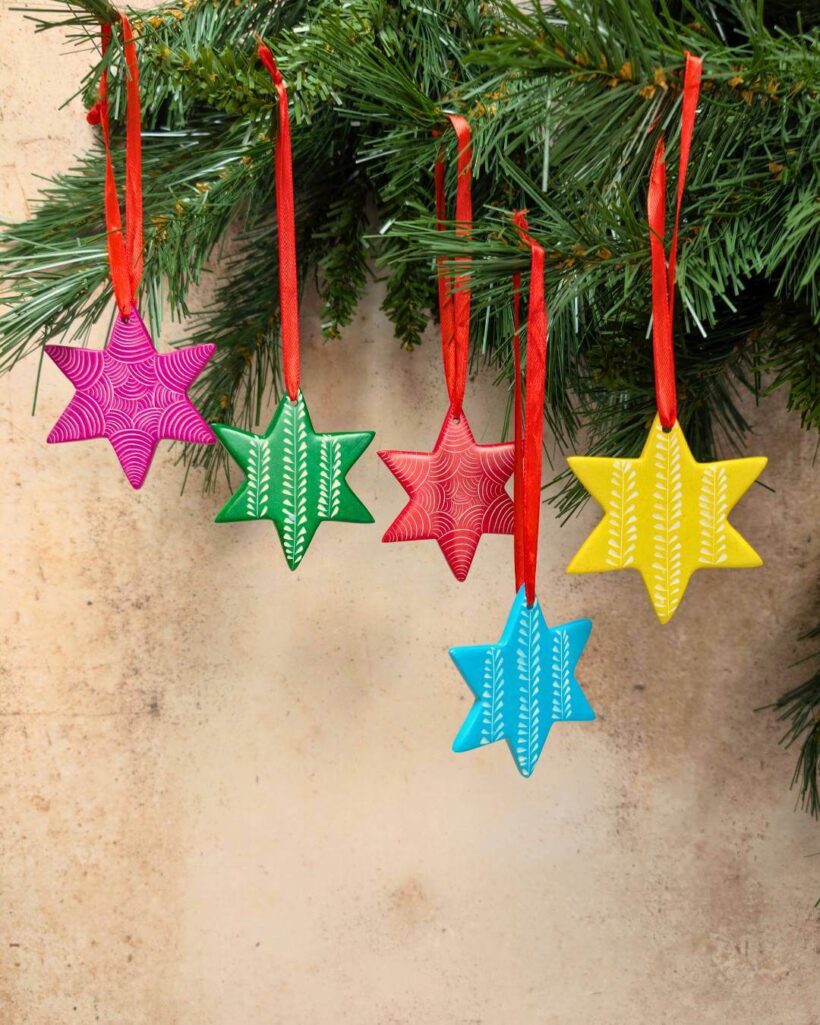 Bring a touch of handmade magic to your festive décor with these vibrant soapstone star decorations. Each star is hand-carved, painted, and etched with unique patterns by the Tabaka Chigware Youth Group in Kenya – finished with a red hanging ribbon, ready to shine on your tree.