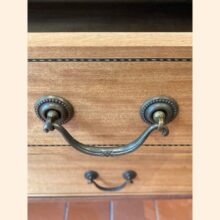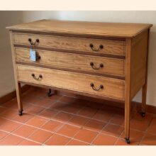 Mahogany 3 drawer chest of drawers/sideboard, sanded and waxed with top quality Osmo oil leaving an environmentally friendly food safe finish. Likely Edwardian, circa 1910, bleached mahogany. Original drawer pulls have been saved, returning to their original colour, cleaning them naturally. The drawers are on their original castor wheels which can be removed. 2 circular holes and 2 aged marks in top surface under wax, as seen in the photos. This product has been restored in an environmentally friendly way so no chemicals or strippers are used, waxes leave an environmentally friendly finish and any primers and paints if used are top quality environmentally friendly too. Only one available so make this beautiful piece of furniture yours now!