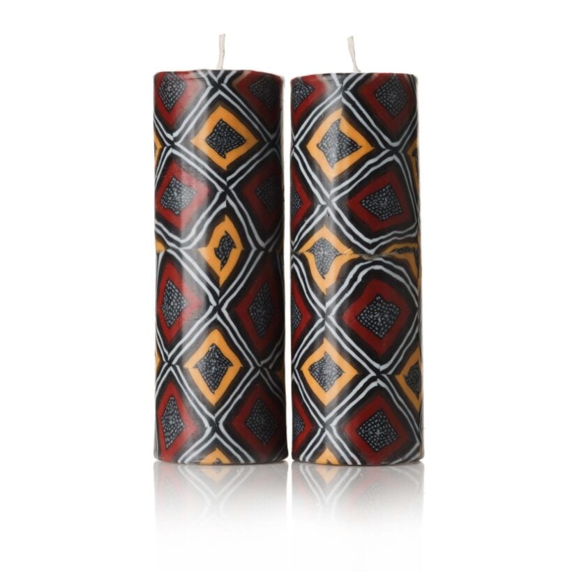 Discover the beauty of our Mudcloth Candle Gift Set of Two Pillar Candles, available in two sizes. Each candle is crafted from high-quality wax and showcases a stunning dark Bogolan design that adds depth and character to your space. Bogolan, or mud cloth, is a traditional Malian textile made from hand-woven cotton and dyed with fermented mud and natural pigments. This culturally rich pattern reflects the artistry and heritage of the Bamana people of Mali.