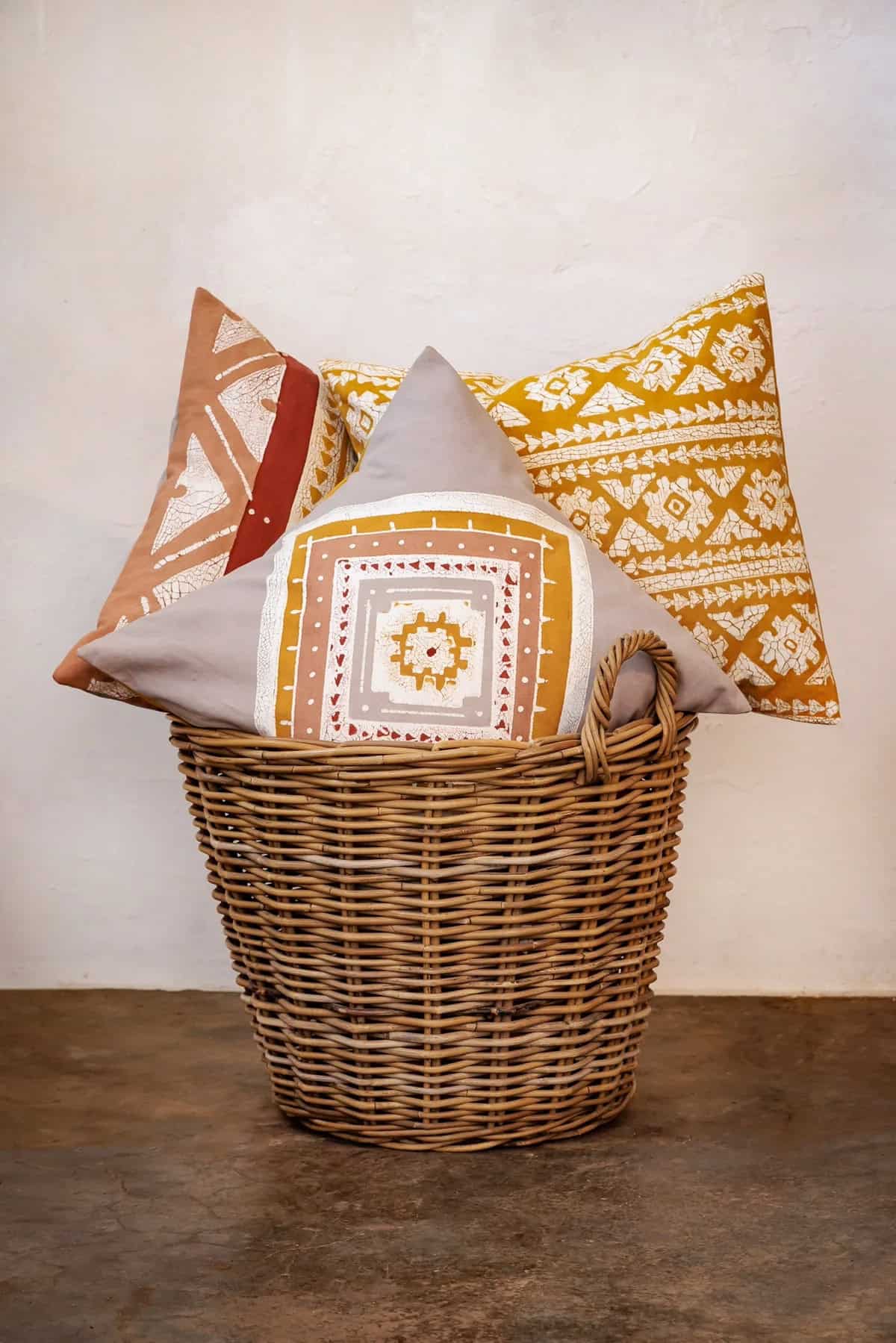 Using locally sourced hand-spun natural GMO free cotton, each pillow cover is hand-drawn using a starch resist – a technique that takes years to perfect! – then painted, sun-dried, and baked to create a distinctive crackle texture, making every piece completely unique.