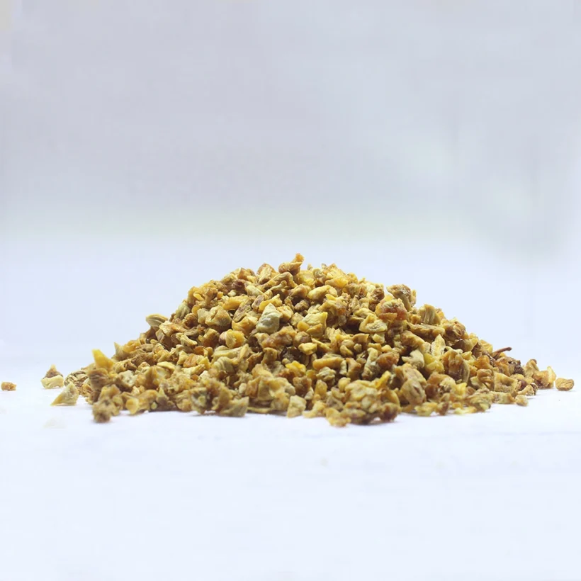 Organic dehydrated pineapple is cut in to small dices like pieces.