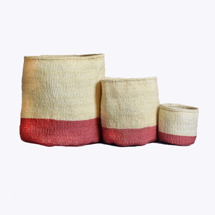 These pink storage baskets are woven from sustainable sisal and are a beautiful creamy white on top with a blush pink colour block at the bottom. They have been woven by hand by a small women’s group in the Kasigau – which is located in an “elephant corridor” that connects the Tsavo West National Park with the Tsavo East National Park.
