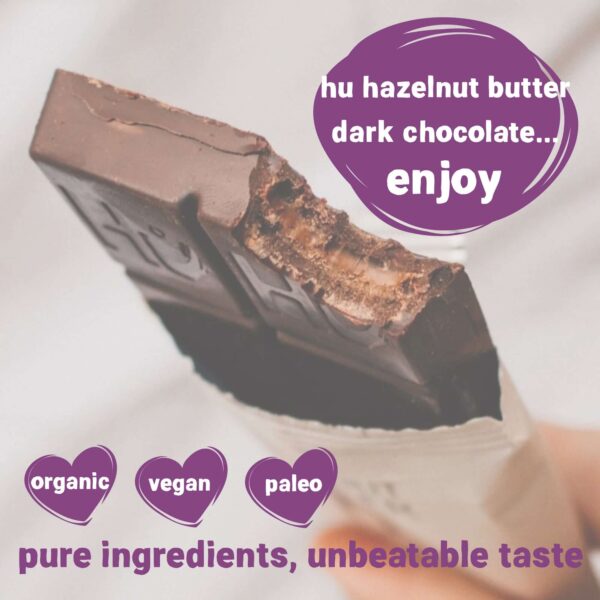 - Full size HU hazelnut butter filled dark chocolate bar – organic, vegan, paleo: ‘Pure Ingredients, Unbeatable Taste’.