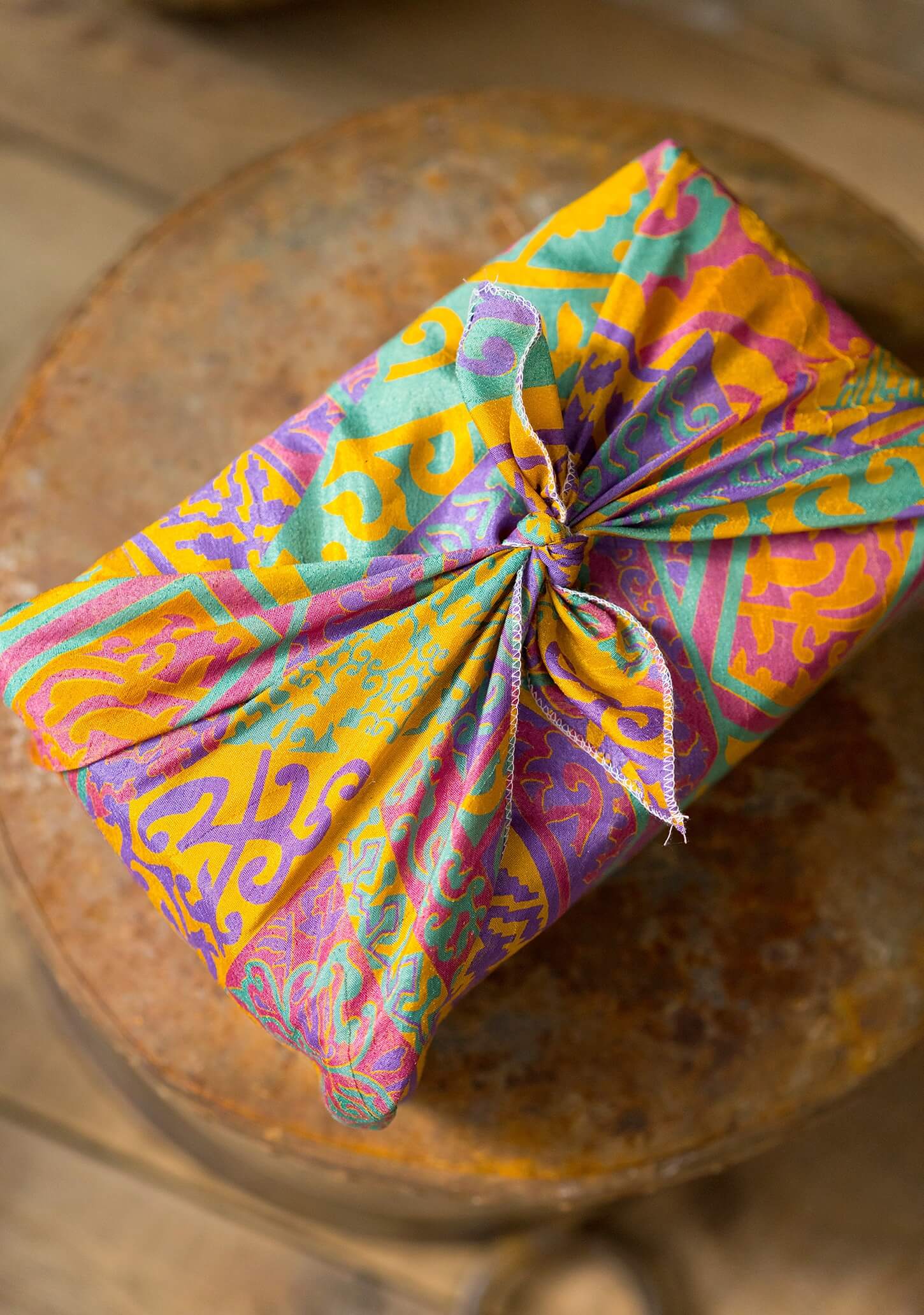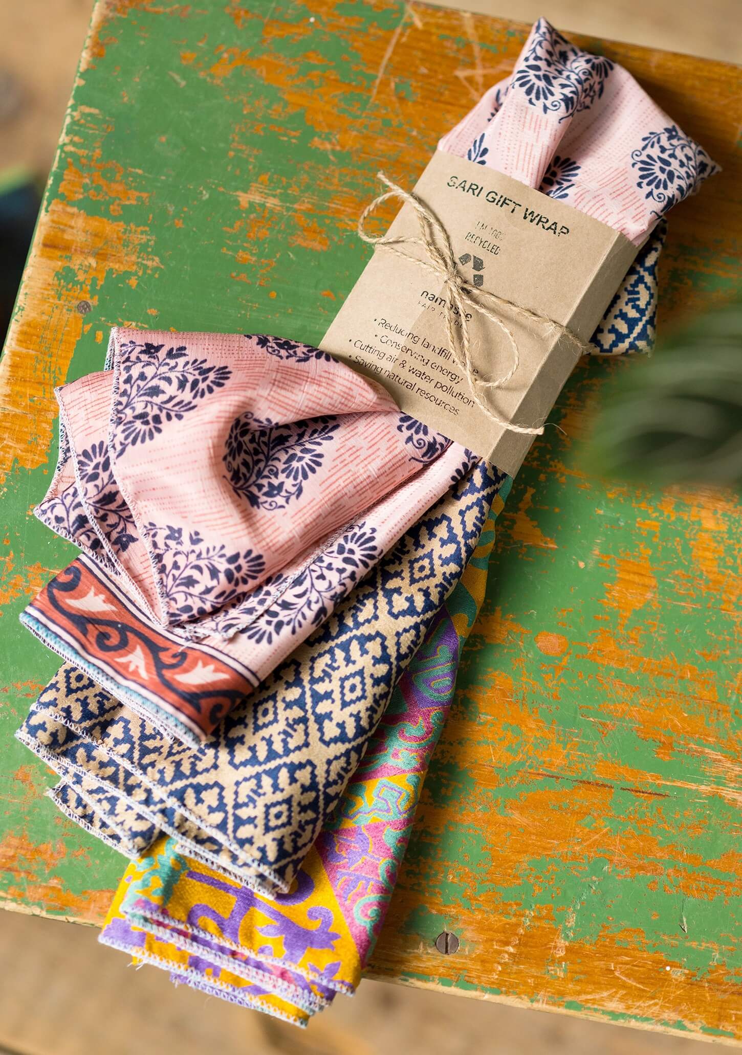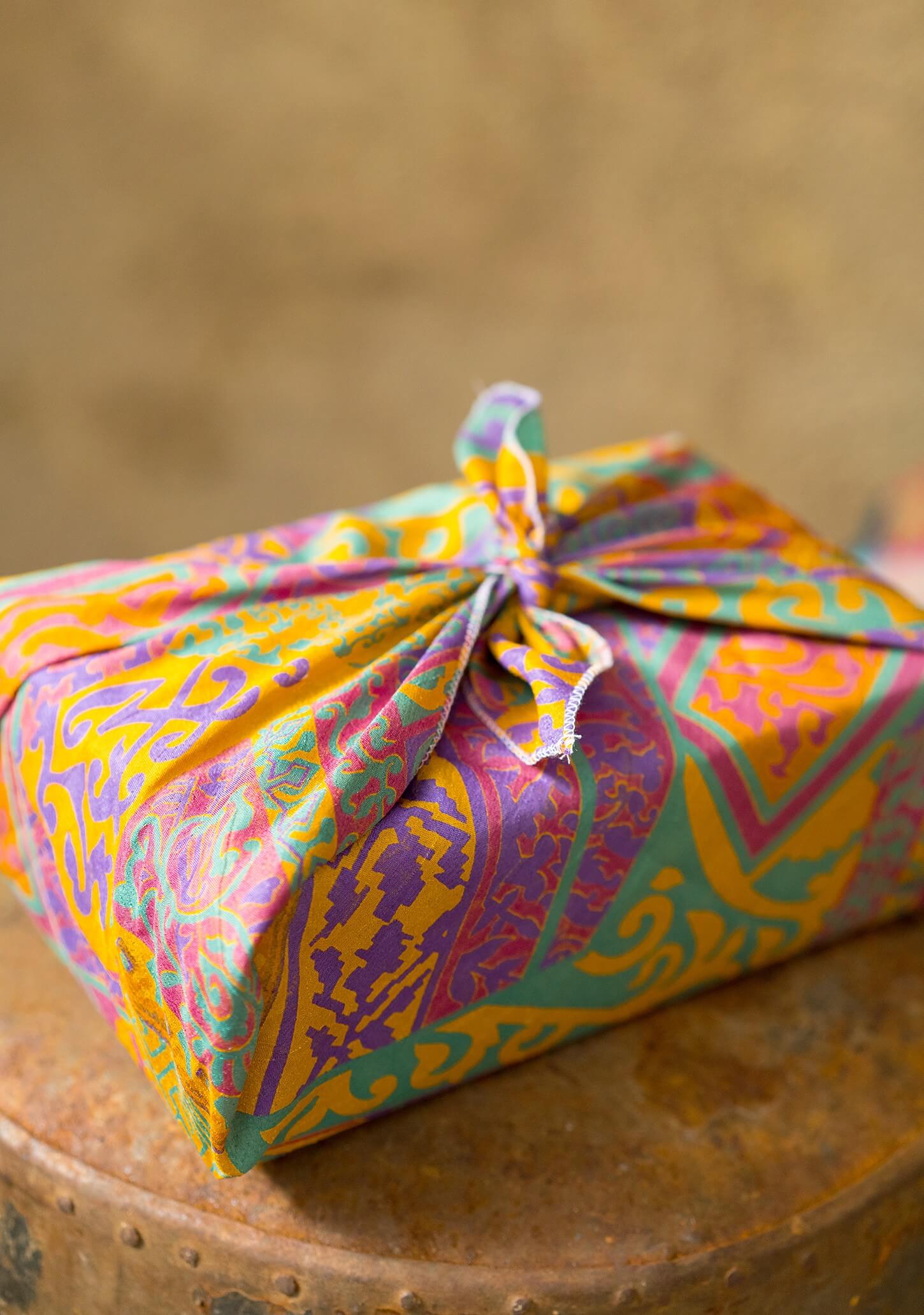 This extra special eco gift wrap in assorted squares of recycled sari fabric is an additional gift for the recipient. It can be reused innumerable times, performing a lifespan of practicality. Edged in tidy stitching, it may be used in alternative ways such as a hair wrap, headscarf or ornamental accessory. Patterns and colours will vary.