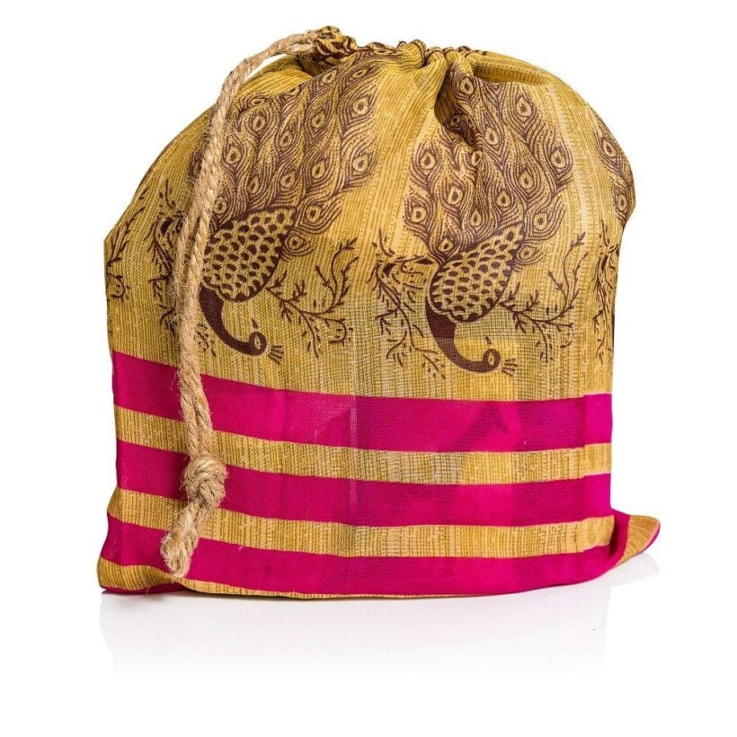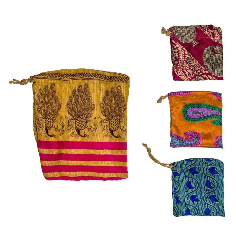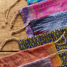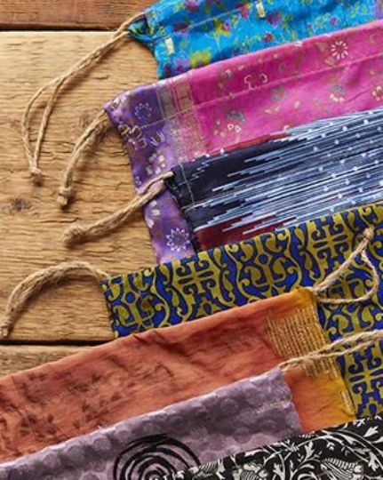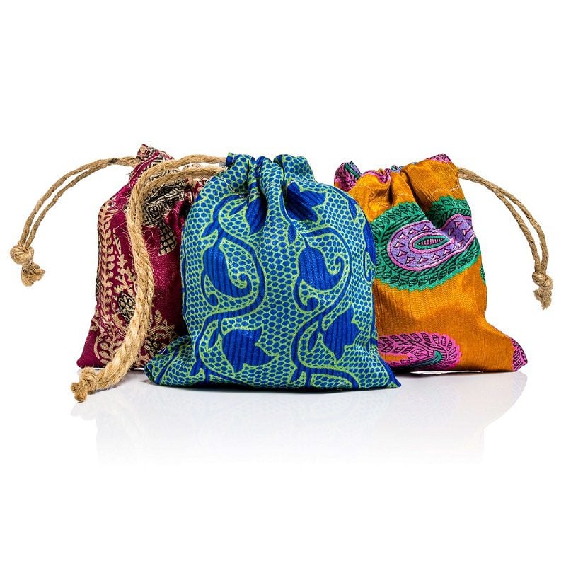 Pretty and reusable eco-friendly gift bags with drawstrings that have been made from sari fabric offcuts produced by the Indian garment industry.