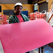 The wax is coloured by mixing pigments with hot wax, which is then poured into flat sheets.