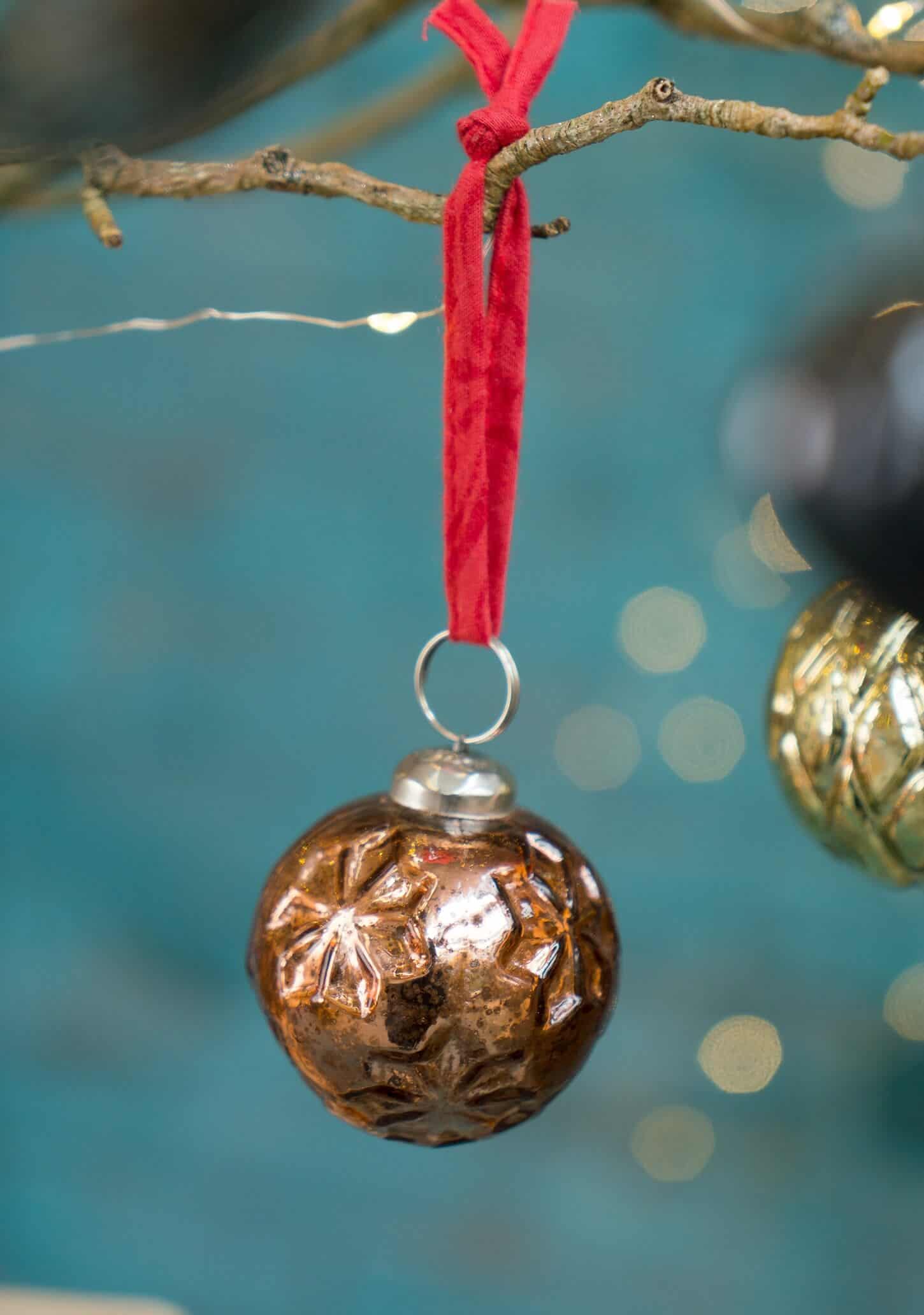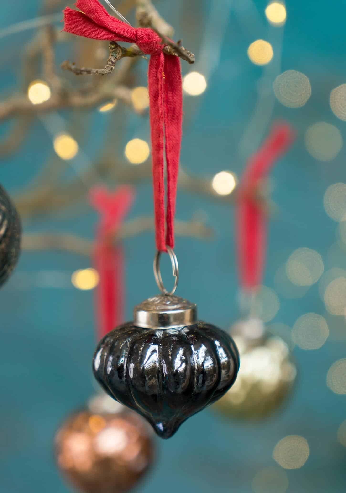 Illuminate your holiday decor with our Set of 5 Coloured Recycled Glass Baubles. Each bauble, measuring 5 x 5 x 5 cm, features unique traditional shapes and stunning iridescent colours that add a touch of charm to your festive arrangements. The silver-coloured cap is conveniently pre-tied with bright red sari material, making them easy to hang and adding a pop of colour to your tree.