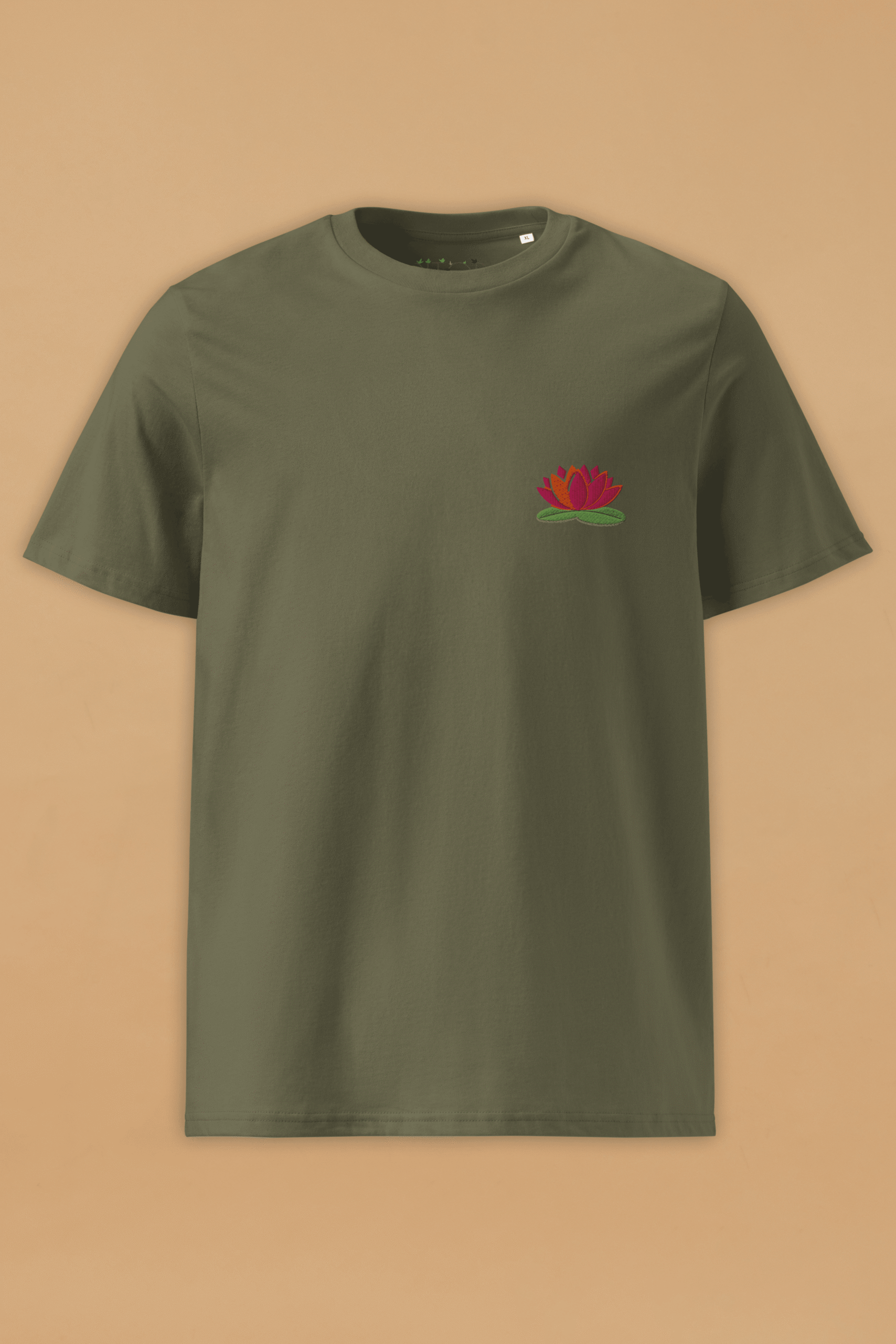 Embroidered on the left chest, the delicate water lily serves as a reminder that protecting these ecosystems means protecting our future. Designed in collaboration with Rainforest Foundation UK, this khaki t-shirt is part of a special collection that donates 10% of sales value to support rainforest conservation and Indigenous communities—the true guardians of the forest.