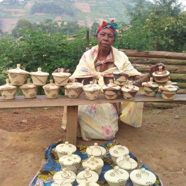 These grass-woven baskets have been handmade by a group of women in a rural community bordering Bwindi Impenetrable National Park in southwest Uganda.